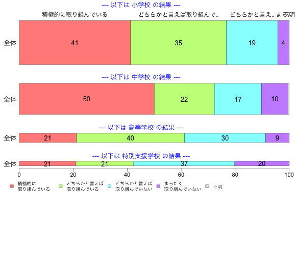 | 積極的に取り組んでいる | どちらかと言えば取り組んでいる | どちらかと言えば取り組んでいない | まったく取り組んでいない | 不明 | N (特別支援学校) | |